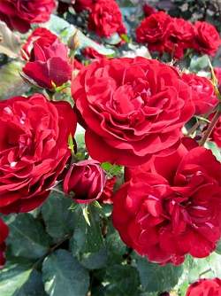 Роза Tornado (Торнадо). Превосходная роза для акцентных посадок и массивов. Цветет практически без перерыва все лето шапками цветов, не болеет, не выгорает на солнце, не замечает дождей, долго держит цветы, чисто отцветает. Окраска чисто-красная. Размер цветка 7 см. Куст ветвистый, до 90 см. Хороша в бордюрах, на клумбах.