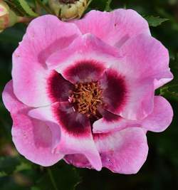Роза Trendy Babylon Eyes (Тренди Бэбилон Айз). Сортосерия "Babylon Eyes". Цветки диаметром 6 см, простые (4-8 лепестков), фиолетово-розовые с пурпурным пятном в основании лепестков. Тональность цветков в процессе цветения меняется. Цветение обильное, повторное в течение сезона. Листва устойчивая к заболеваниям. Куст компактный, высотой 50-70 см. Рекомендуется как бордюрная, контейнерная или балконная роза.
