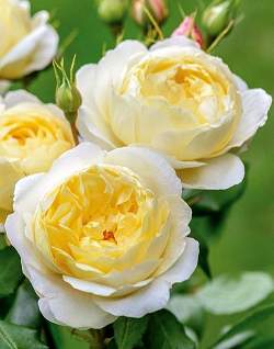 Роза Vanessa Bell (Ванесса Белл). Бутоны округлые, с розоватым оттенком. Цветки среднего размера, махровые (17-25 лепестков), нежно-лимонно-жёлтые, чашевидные, в больших рыхлых соцветиях. Внешние лепестки бледнеют до белого, создавая эффект свечения. Аромат прекрасный, зелёного чая с нотками лимона, средней силы.