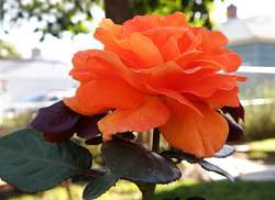 Цветки махровые, светящиеся насыщенно-оранжевые, чистого оттенка, не выцветают, устойчивы к дождю. Количество лепестков более 35 шт. Окраска стабильная до конца цветения. Умеренный пряный аромат.