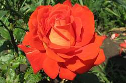 Очень яркая чайно-гибридная роза. Куст прямостоячий, высотой 100-120 см. Цветок диаметром 10-12 см, насыщенного оранжевого цвета, обратная сторона лепестков имеет матово-белый оттенок. Бутон бокаловидной формы, очень плотный (имеет 26-40 лепестков), при раскрытии серединку не показывает. Цветы появляются на концах побегов по одному в течение всего сезона.
