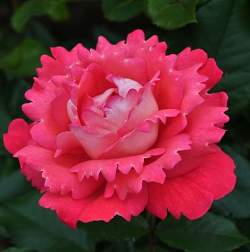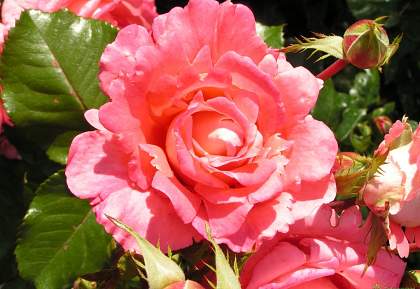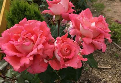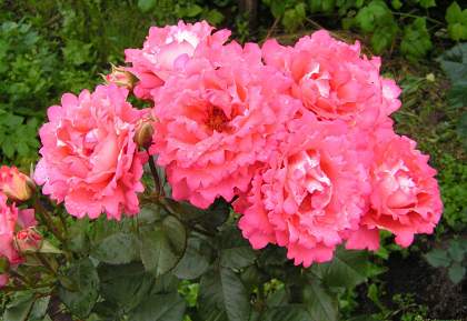 Роза Waikiki (Вайкики). Цветки мягкого кораллового оттенка с розовой атласной изнанкой и волнистым краем. Цветов и бутонов множество и все смотрят вверх, не поникая, дождя не боятся и держатся долго. Листва темно-зеленая, глянцевая. Молодые листья свекольного цвета.
