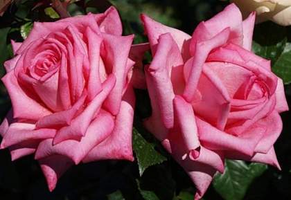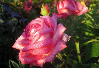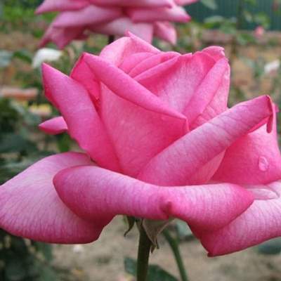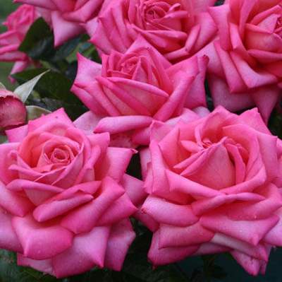 Роза чайно-гибридная Wedding Bells (Веддинг Белз). Цветки насыщенного розового цвета с оттенком перламутра, крупные (до 16 см), с умеренным ароматом, классической формы чайно-гибридной розы с высоким центром и отгибающимися наружу в виде треугольника лепестками.