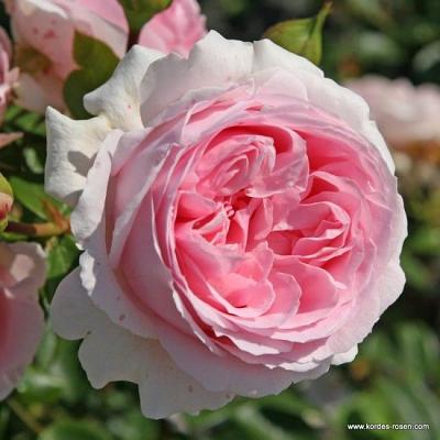 Цветки крупные, густомахровые, со светлыми внешними лепестками, окружающими чудесный розовый шар. Кажутся хрупкими, но долго держатся в цвету и очень устойчивы к непогоде.