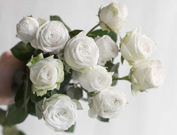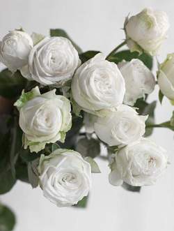 Роза White Bombastic (Вайт Бомбастик). Пионовидная густомахровая спрей-роза с бутонами бело-кремового цвета. Диаметр цветка 6-7 см. Цветки собраны в крупные соцветия. Цветение обильное и продолжительное. Листва мелкая, глянцевая, тёмно-зелёная. На стеблях почти нет шипов. Сорт с легким приятным ароматом. Высокая устойчивость к мучнистой росе и черной пятнистости. Подходит для срезки. В вазе стоит до 10-12 дней.