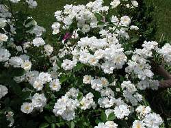 Роза White Fairy (Вайт Фейри). Широко распространенная полиантовая роза, и одна из самых легких в культуре. Цветки белые, появляются в длинных воздушных кистях по 10-40 шт. Сорт начинает цвести достаточно поздно, но цветение продолжается практически без перерыва до поздней осени.
