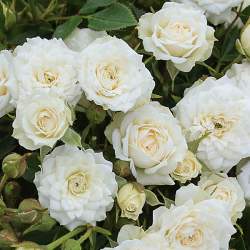 Роза White Gem (Уайт Джем). Цветки диаметром 5 см, махровые, вначале белые с оттенками, затем чисто-белые. Очень красивая форма цветка, недаром название в переводе — "Белое сокровище". Цветение обильное, повторное в течение сезона. Листва среднеустойчивая к заболеваниям. Куст компактный, высотой 30-40 см.