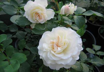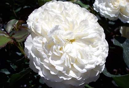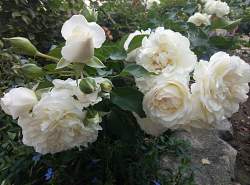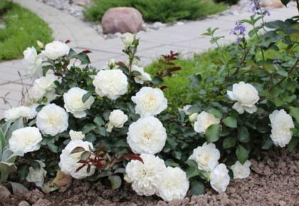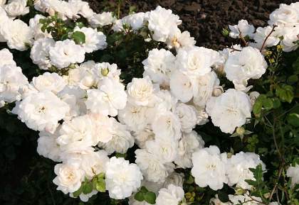 Роза полиантовая White Meidiland (Уайт Медийян). Цветки белые, махровые, среднего размера, 6-8 см, собранные в соцветия по 5-10 шт. Листья большие, тёмно-зелёные, блестящие. Куст раскидистый. Побеги толстые, светло-зелёные, жёсткие, с многочисленными светлыми шипами. Полностью морозостойкий, обильно и продолжительно цветущий сорт. Цветет непрерывно.