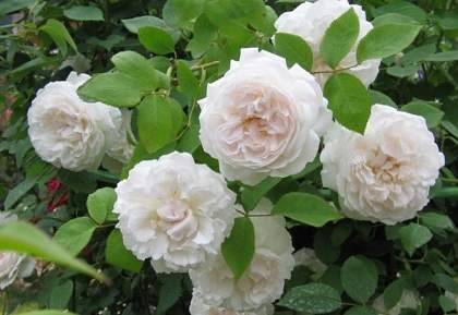 Куст хорошо ветвится, одет густой матовой чисто-зеленой листвой, не подверженной грибковым заболеваниям. Длинные цветочные побеги разветвляются на верхушке и образуют красноваты бутоны, из которых появляются чисто-белые цветки около 10 см в диаметре. Они душистые, с чудесным свежим и сладким ароматом старинных роз, меда и цветущего миндаля.