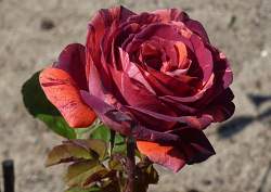 Роза Yannick Noah (Янник Ноа). Уникальный по окраске сорт. Цветки диаметром 8 см, махровые (до 35 лепестков), шелковистые, коричневато-гранатовые с алыми полосками, одиночные и в небольших соцветиях. Каждый цветок неповторим. Аромат умеренный.