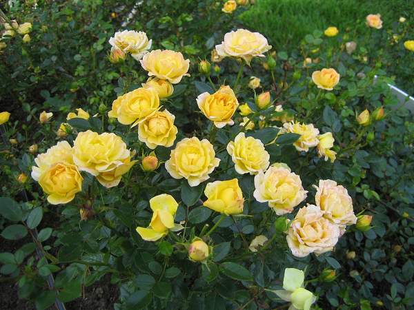 Роза Yellow Fairy (Йеллоу Фейри). Это красивая полиантовая роза, хотя Yellow Fairy позиционируют как почвопокровную. Цветки густомахровые, в кистях по 3-8 шт., покрывают всю поверхность растения. Они ярко-желтые когда только раскроются, с золотыми и янтарными тонами ближе к центру, но за пару следующих дней выгорают до лимонных и кремовых.