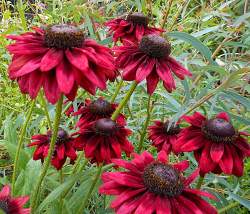 Рудбекия Cherry Brandy (Черри Бренди). Очень привлекательный сорт, особенно если высаживать группами. Цветки вишнёво-красные с тёмно-шоколадным конусом, крупные, более 10 см, махровые или простые. Цвет изменяется от очень тёмно-красного в центре до более светлого на кончиках изогнутых лепестков.