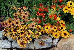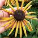 Рудбекия волосистая Chim Chiminee (Чим Чимни). Цветки большие, с десятью различными оттенками — от жёлтого до оранжевого и кирпично-красного. Лепестки очень узкие, окружают коричневый конус. Великолепный сорт для срезки. Устойчив к засухе.