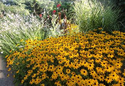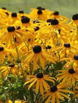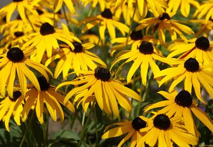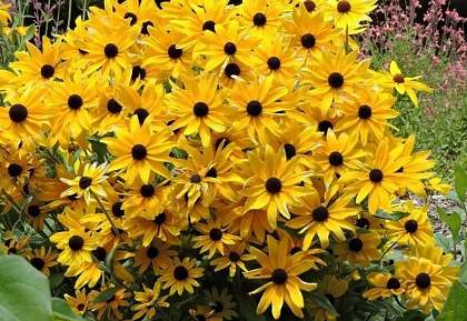 Рудбекия Goldsturm (Голдштурм). Неприхотливый и очень эффектный многолетник. Образует мощный куст высотой до 70 см с многочисленными разветвленными цветочными побегами. Диаметр куста 45 см. Листья зубчатые, светло-зеленые. В июле-октябре цветет крупными ярко-желтыми цветами с коричневым центром, похожими на ромашки. Цветение чрезвычайно продолжительное, обильное, яркое, вплоть до заморозков.