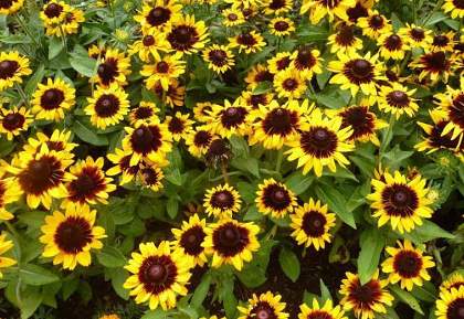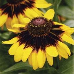 Рудбекия Sonora (Сонора). Компактный сорт с привлекательной контрастной окраской. Центр очень темный, коричневый, лепестки желтые, у основания коричневые. Высота около 30 см. Хорошо разрастается, образует куст диаметром до 40 см. Цветки-корзинки очень крупные, 12-15 см в диаметре.
