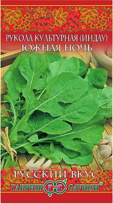 Рукола культурная (индау) Южная ночь. Раннеспелый (26-30 дней после появления всходов) сорт. Розетка листьев полувертикальная, массой 20-25 г. Лист лировидный, крупный, сильно рассеченный, светло-зеленого цвета, пряно-горчично-оливкового вкуса. Молодые нежные листья руколы придадут незабываемый яркий аромат салатам, овощным, мясным блюдам, пицце. Посев проводят с апреля по август непосредственно в грунт на глубину 1 см. Можно выращивать в качестве горшечной культуры. Растение неприхотливо, нуждается в частых поливах.