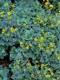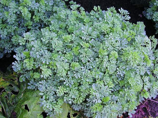 Рута душистая Jackmans Blue (Жакменс Блю). Декоративный и лекарственный полукустарник высотой 45 см, ценится за серо-голубую ажурную матовую листву. Стебель прямостоячий, разветвлённый, деревянистый у основания. Цветки мелкие жёлтые, в кистевидных соцветиях.