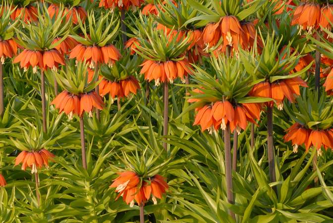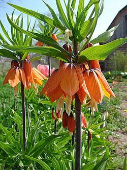 Рябчик императорский Аврора. Цветок оранжевый. Высота растения 80-100 см. Висячие колокольчатые цветки оранжевого цвета, над которыми хохолком возвышаются узкие зеленые листья. Бутоны обращены вниз, иногда даже отклоняются к цветоносу. Цветки сначала тоже смотрят вниз, а через несколько дней начинают отклоняться от цветоноса в стороны.