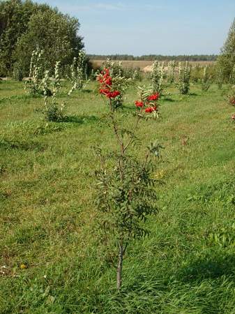 Рябина Концентра. Рябина Концентра — сорт раннего срока созревания, зимостойкий. Деревья высокорослые, с пирамидальной формой кроны. Листья крупные, зеленые, снизу белесые, листочки крупные, зеленые, ланцетовидные, по краям пильчатозубчатые. Урожай с одного дерева — 15 — 25 кг. Плоды овально — круглые, широкоребристые, ярко — оранжевые, в щитке по 70 — 100 штук. Мякоть сочная, оранжевая, без горечи и терпкости. Плоды долго висят не осыпаясь, пригодны для потребления в свежем и переработанном виде.