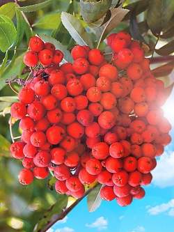Рябина Сорбинка. Один из новейших сортов. Высота взрослого дерева может достигать 5 метров. Крона овальная. Славится очень крупными, массой до 3 г ягодами. Они собраны в щитки, вес одного может достигать трехсот грамм. Ярко-красные, с желтоватым оттенком и подкожными точечками цвета солнца плоды украсят дерево уже в конце августа. Они приятного, кисловатого вкуса, без терпкости и горечи.