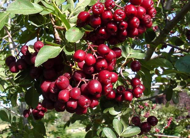 Рябина гибридная Титан. Невысокое деревце с компактной кроной. Листья темно-зеленые, блестящие, в нижней части перисто-рассеченные, в верхней эллиптические. Сорт зимостойкий, ежегодно обильно плодоносит. Хорошо размножается черенками. Плоды бордового цвета, сочные, кисло-сладкие, немного терпкие, очень лежкие, до 9 месяцев.