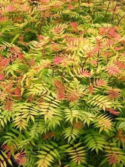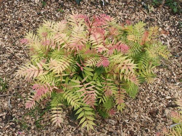 Рябинник Pink Hopi (Пинк Хопи). Кустарник с плотной необычайно красивой легкой кружевной листвой. Весной на кусте можно одновременно наблюдать настоящую цветовую радугу. Длинный лист состоит из многочисленных мелких листочков с зазубренными краями зелеными в нижней части, с золотистым напылением ближе к верхушке и ярко-розовыми верхушечными листочками — такой окрас длится до конца мая, а летом листва становится зеленой.