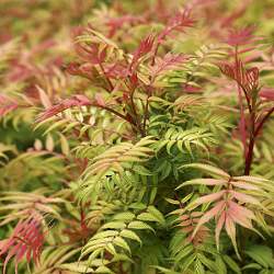 Сорт выведен в Европе сравнительно недавно. Он также неприхотлив, как и его природный прототип, при этом выгодно отличается от дикороса меньшими размерами, а главное — необыкновенно яркой и разнообразной раскраской молодых листьев. Кустарник особенно привлекателен тем, что пик его декоративности приходится на время, когда сад только просыпается от зимней спячки. В это время яркость, особенно в среднем ярусе озеленения, в абсолютном дефиците. Помимо декоративных достоинств, рябинник ценен тем, что устойчив к вредителям и болезням, и никогда не утрачивает декоративности.