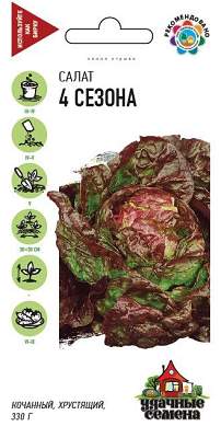 Салат 4 сезона кочанный красный. Среднеспелый (87 -94 дня от полных всходов до полной спелости) сорт кочанного салата. Предпочитает плодородные, удобренные почвы. Выращивают рассадным и безрассадным способом. Розетка листьев горизонтальная, высотой 20 см, диаметром 27 см. Кочан открытый, округлый, средней плотности, массой 330 г. Лист красноватый, пузырчатый, слабоволнистый по краю, хрустящей консистенции. Ценится за привлекательный внешний вид и отличный вкус. Урожайность 3,9 кг/м2.