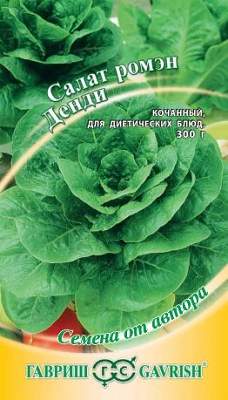 Салат Денди (ромэн хрустящий). Позднеспелый (75-80 дней от полных всходов до уборки зелени) сорт. Рекомендуется для выращивания в открытом грунте. Посев на рассаду осуществляют в марте, высадка рассады — в апреле — мае. Салат ромэн. Розетка приподнятая, образует кочан удлиненноовальной формы. Нейтрален к длине дня, вынослив к перепадам температур. Листья крупные, овальные, темно-зеленые, слабопузырчатые, с ровным краем. Консистенция листьев плотная, кожистая. Сорт устойчив к цветушности, краевому ожогу, относительно засухоустойчив. Норма высева 0,1-0,2 г/м2. Схема посадки 20x30 см. Урожайность 2,6-3,8 кг/ м2.