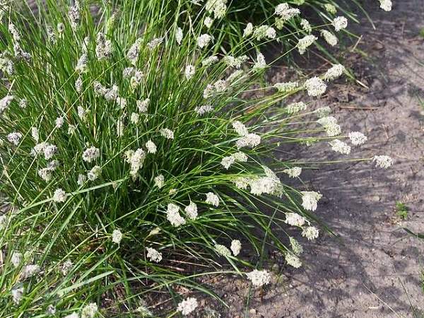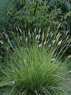 Сеслерия серебристая. Листья узкие, серо-голубые, образуют сферическую кочку высотой 25 см. В цветении высота 45 см. Растение полувечнозеленое, отрастает рано весной, скоро появляются серебристые колоски. Цветение с июня до морозов. Предпочитает солнечные места и хорошо растет на любых почвах, кроме сильно заболоченных. Обычно листья живут 2-3 года, поэтому старые листья выборочно удаляют весной.