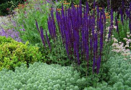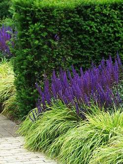 Шалфей Mainacht (Майнахт). Изящный куртинный многолетник. Листья узкоовальные, темно-зеленые, слегка шероховатые, ароматные. Соцветия представляют собой узкие кисти фиолетово-голубых цветков. Цветет очень обильно и продолжительно. При своевременном удалении отцветших соцветий возможно повторное цветение.