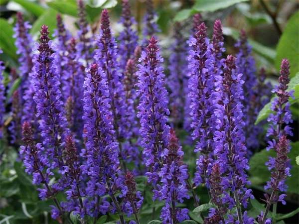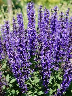 Шалфей Merleau Blue (Мерло Блю). Цветки фиолетово-синего цвета, многочисленные, двугубые, собраны в прямостоячий плотный ложный колос. Листья некрупные, серо-зелёные, морщинистые, с волнистыми краями, овально-ланцетовидные. Вырастает около 40-50 см в высоту.
