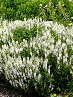 Шалфей дубравный Schneehugel (Шнеехугель). Травянистый многолетник. Стебли прямые, ветвящиеся. Нижние листья крупные, черешчатые, продолговатые, с сердцевидным или округлым основанием. Верхние листья мелкие, сидячие. Цветы распускаются в конце июня и собираются в длинные колосоподобные соцветия белого цвета.
