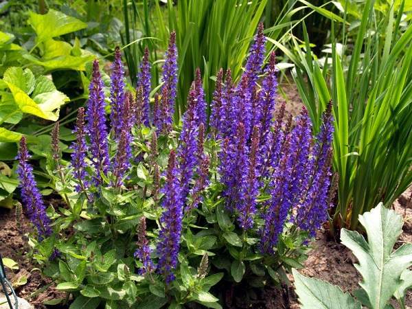 Сортовые шалфеи отличаются от обычных не только цветом и размером, но также и формой куста. Кустик более плотный, свечи соцветий стоят густо, ровно, не поникают, куст не разваливается, сохраняя аккуратную форму и после цветения.