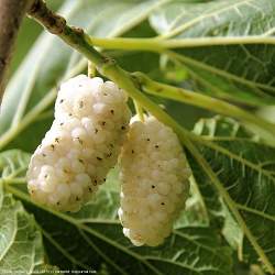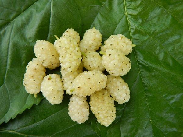 Шелковица белая. Листопадное урожайное дерево, распространённое в умеренных и субтропических зонах Северного полушария. Ягоды сочные, крупные, обладают целебными свойствами. Плодоносит шелковица обильно и регулярно; ягоды созревают в июне-июле, по мере созревания их стряхивают на расстеленную на земле ткань.