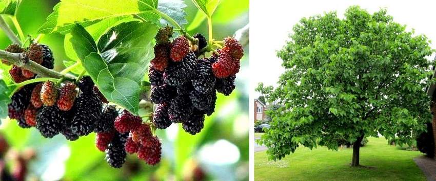 Шелковица чёрная (Morus nigra). Листопадное дерево, достигающее около 12 метров в высоту. Кора дерева и ветвей темно-серого, бурого цвета. Листья темно-зеленые цельные по форме сердцевидные, на ощупь немного шероховатые, с внутренней стороны имеют короткий пушок. Размер листьев от 6-ти до 10-ти см в ширину и до 15-ти в длину.