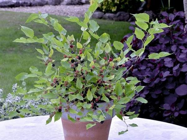 Шелковица черная Mojo Berry (Моджо Берри). Карликовая шелковица, достаточно компактная, чтобы расти в большом горшке, дающая вкусные сочные ягоды с поздней весны до поздней осени. Урожай можно собирать уже с первого года. Награждена премией "Растение года" на цветочной выставке RHS в Челси в 2017 году. Достигает высоты 1,2-1,5 метра. Предпочитает полное солнце. Зимостойкость до -18 °С. В средней полосе России требует укрытия или перестановки на зиму в подвал.