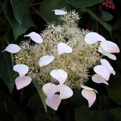 Декоративная лиана, карабкающаяся при помощи воздушных корешков до высоты более 6 метров. Главным украшением являются крупные (3-5 см), белые лепестки бесплодных цветков, образующие венок вокруг соцветия. Цветки розовеют. Соцветия крупные, до 25 см в диаметре. Цветение с июля по октябрь. Листья зубчатые, сердцевидные, темно-зеленые. Осенью желтеют. Красновато-коричневые стебли красиво смотрятся зимой.