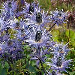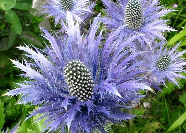 Синеголовник альпийский. Эффектное растение высотой до 70 см с прямостоячими стеблями, разветвлёнными вверху. Листья кожистые, прикорневые — крупные, сердцевидные; стеблевые — пальчато-рассечённые.