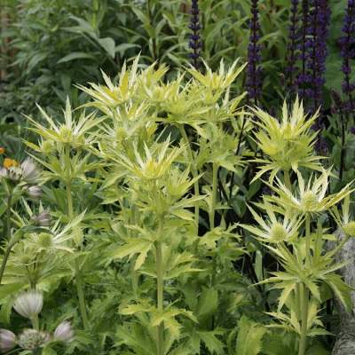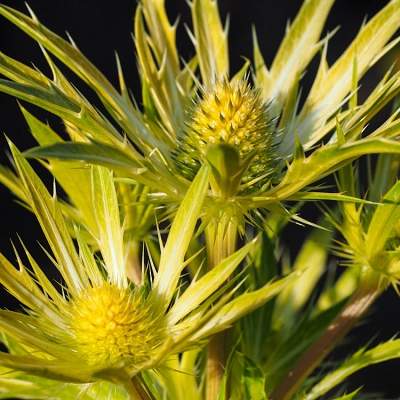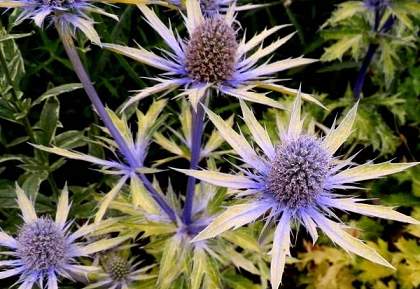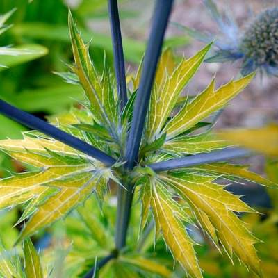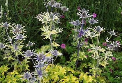 Синеголовник Neptunes Gold (Нептунс Голд). Необычный английский гибрид синеголовника Забеля — Neptune's Gold — был высоко оценен на выставке в Челси. У этого растения высотой около 50 см яркие золотистые листья и прицветники создают контраст с голубыми стеблями и головчатыми соцветиями цвета барвинка.
