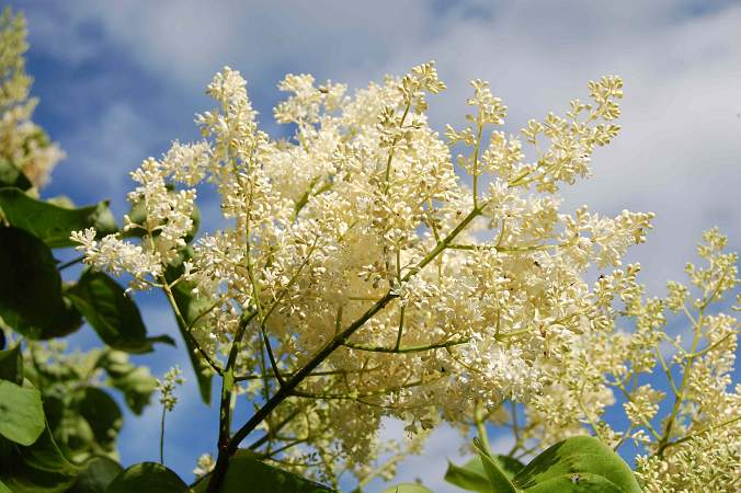 Цветочки не крупные, воронковидные, приятного бело-кремового цвета. Они собраны в большие и пышные соцветия-метелки. Сирень амурская очень душистая, пахнет медом, чем привлекает бабочек и пчел. Метелки 15-25 см длиной и до 20 см диаметром. Предпочитает хорошо дренированные, влажные, плодородные, слабокислые или нейтральные почвы, не выносит затопления. Засухоустойчивость средняя.