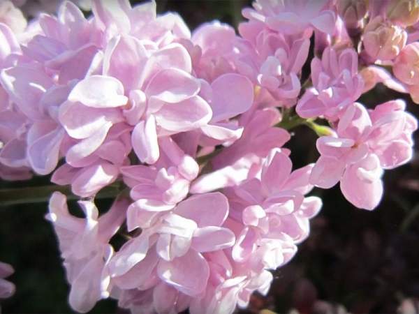 Сирень Анастасия Ширинская. Соцветия плотные, удлиненной формы. Бутоны округлой формы, зеленоватые. Цветки махровые, асимметричные, с закрытым центром, на темно-лиловых трубочках. Лепестки бледно-лилово-розовые, приобретают со временем голубоватый оттенок.