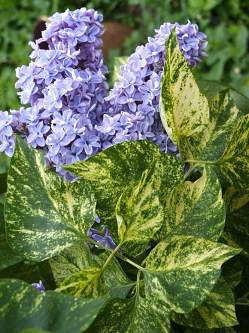 Сирень обыкновенная Aucubaefolia (Аукубафолия). Бутоны пурпурно-розовые, цветки полумахровые, лилово-голубоватые, соцветие до 25 см, из одной-трех пар узкоконических метелок; окраска листьев сходна с аукубой — золотистые пятна на листьях. Используется как красивоцветущее растение в различных видах древесно-кустарниковых групп, одиночных посадках, в срезке для создания букетов.