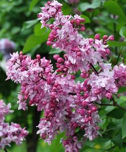 Сирень Богдан Хмельницкий. Яркие, красновато-розовые бутоны дарят нам необыкновенные цветки. Розовые с беловатыми кончиками красиво изогнутых лепестков, они состоят из 2-3 венчиков, диаметр которых равен 3,5 см.