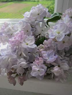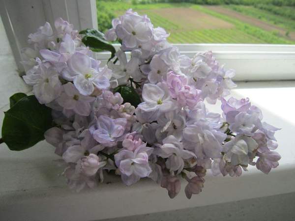 Сирень Чистая вода. Соцветия плотные, пирамидальной формы, слегка поникающие. Бутоны ярко- или лиловато-зеленые на фиолетовых трубочках. Цветки полумахровые, крупные, асимметричные, с расставленными венчиками, с закрытым центром. Лепестки с заостренными верхушками, слегка загнутыми внутрь, с внутренней стороны лиловато-голубые, с наружной стороны светлые с перламутровым отливом.