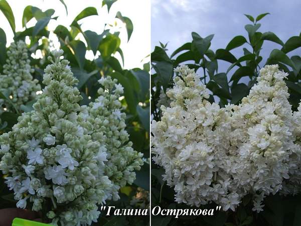 Сирень Галина Острякова. Автор: Бутоны крупные, зеленовато-кремовые. Цветки среднего размера, белые, махровые, лепестки овальной формы. Соцветия крупные, вертикально направленные, стройные, очень плотные. Куст среднерослый, широкий, густой. Зацветает в средние сроки, цветёт обильно, ежегодно. Красивый, обильный сорт с компактными крепкими соцветиями.