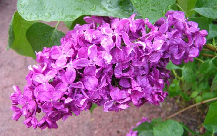 Сирень Индия. Бутоны темно-пурпурные. Цветки густо-лиловые с красноватым оттенком, красиво переливаются на солнце, крупные, диаметром 2,6 см, простые, ароматные, лепестки овальные, со слегка приподнятыми краями, изогнутые.