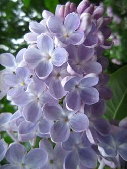 Сирень Ладога. Куст среднерослый, прямостоячий. Соцветия крупные, разреженные, конической формы. Бутоны бледно-лиловые, зеленоватые. Цветки простые, крупные, с жёлтыми тычинками в центре венчика. Лепестки снаружи светло-лиловые, с внутренней стороны голубоватые с белыми стрелками и светлыми кончиками.