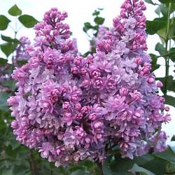 Сирень Лазурная. Бутоны крупные, лиловые. Цветки среднего размера, махровые, лилово-голубые. Соцветия крупные, плотные, компактные, направленные вертикально.