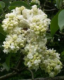 Сирень Лунный Свет. Бутоны зеленоватые, цветки махровые, около 2,8 см, обладают тонким и нежным ароматом. Соцветия крупные, плотные, ширококонические. Цветение продолжительное, обильное. Куст средней высоты.